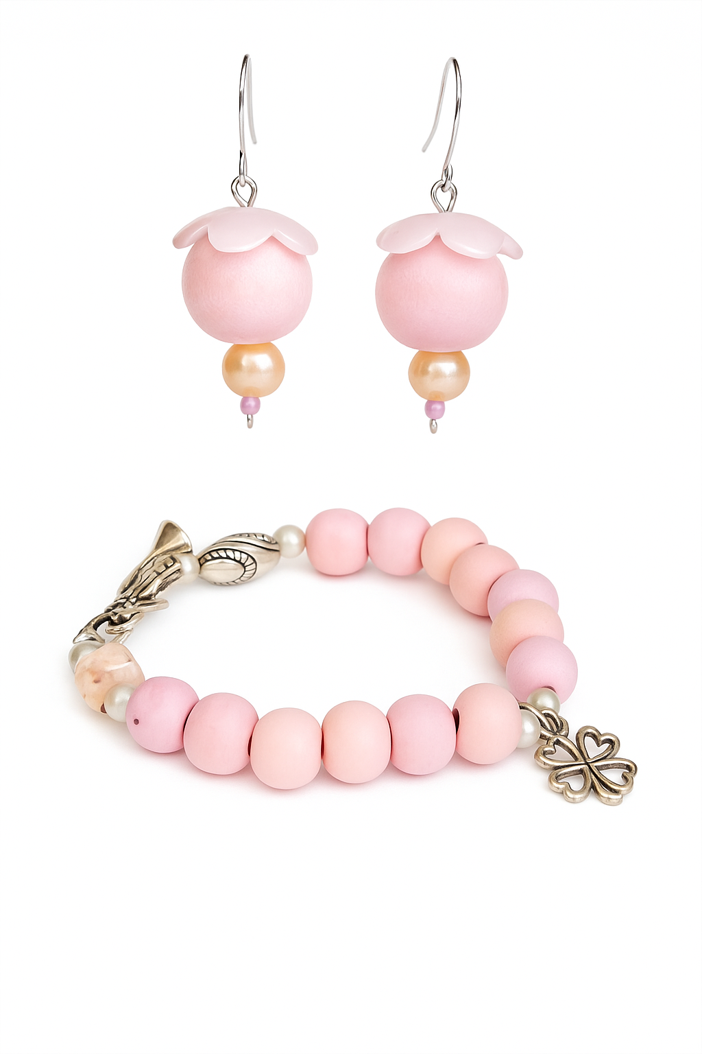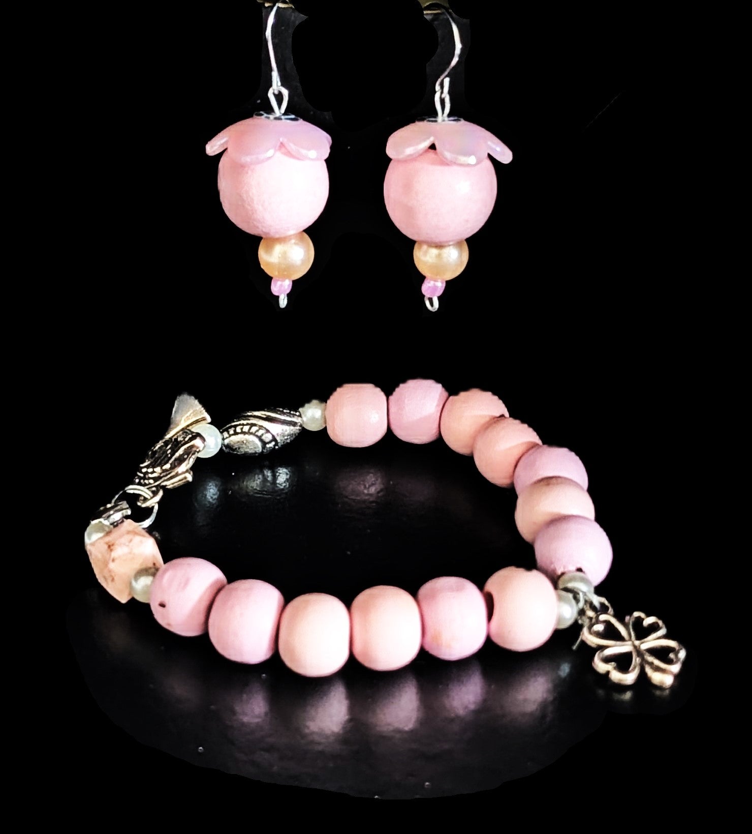 Rosa Blütenohrring mit Kleeblatt Armband